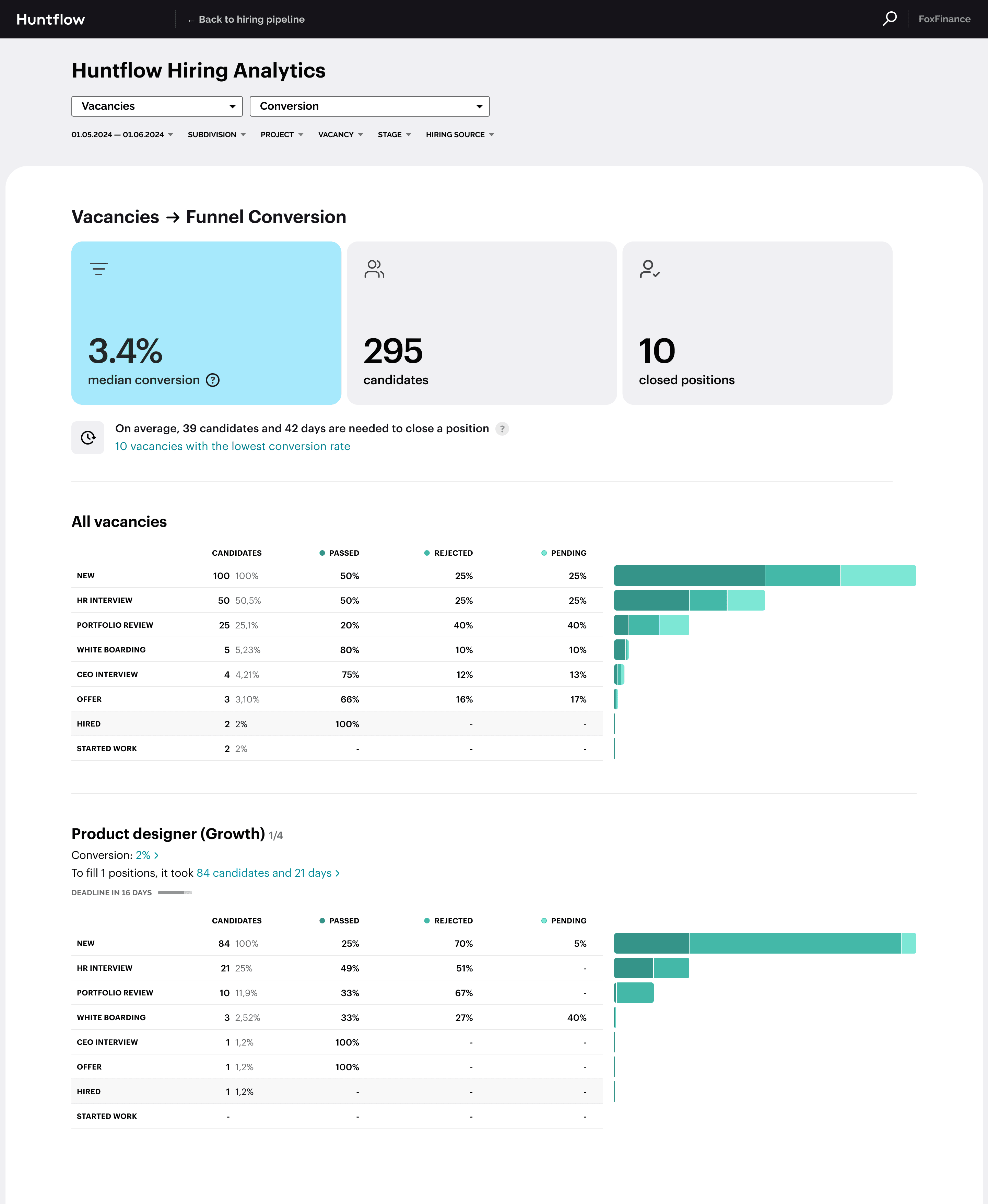 I designed a report that pinpoints bottlenecks, supports capacity planning, and helps to reduce time-to-hire for Huntflow. It is an applicant tracking system used by 4,000+ organisations. Huntflow helps recruiters automate routine and collaborate with hiring managers.